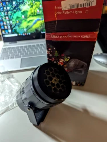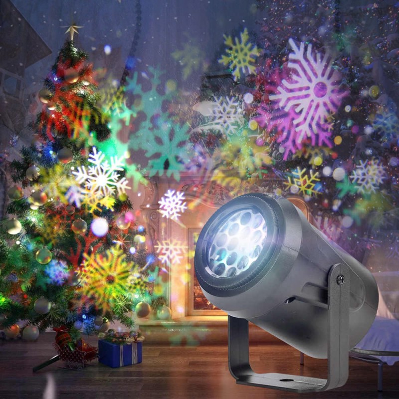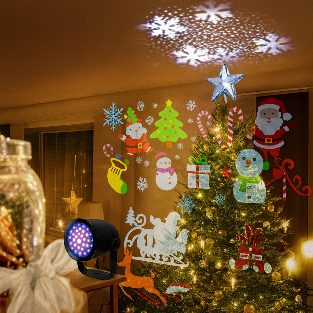 Tiene figuras navideñoas de colores! que van rotando en cada momento, disfruta!